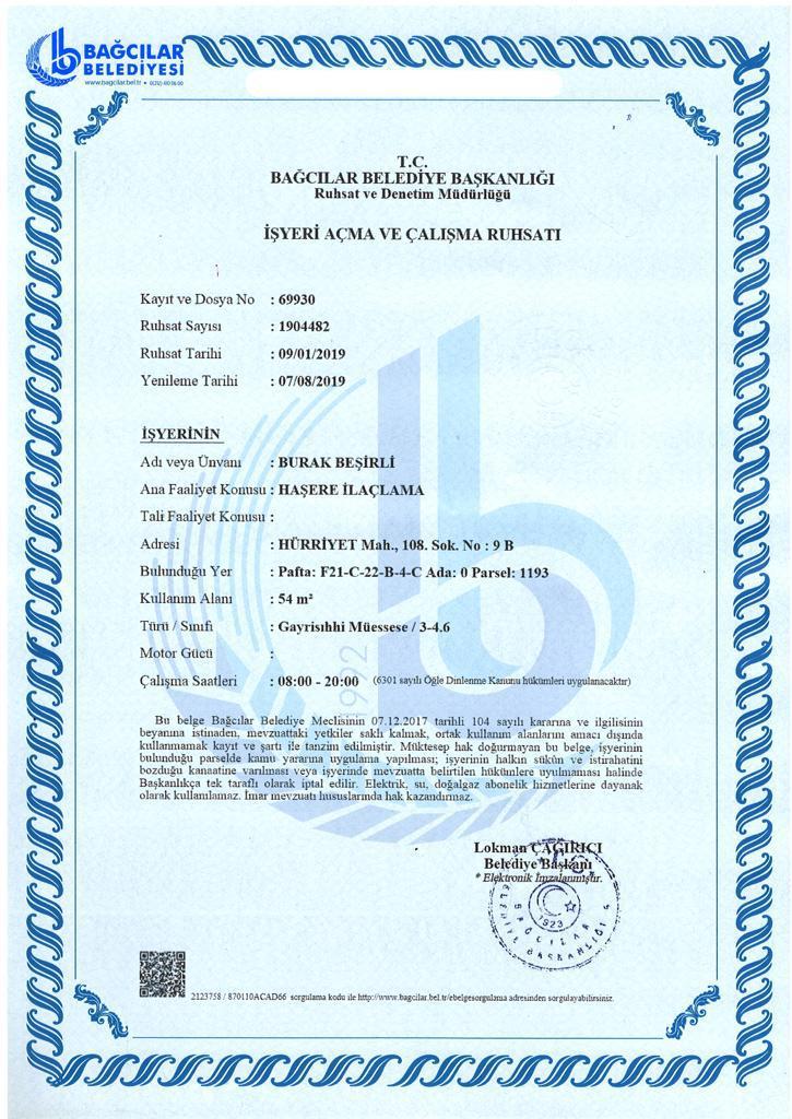 Resmi olarak yetkili olduğumuzu gösteren sağlık bakanlığı onaylı belgelerimiz ve ruhsatlarımız.